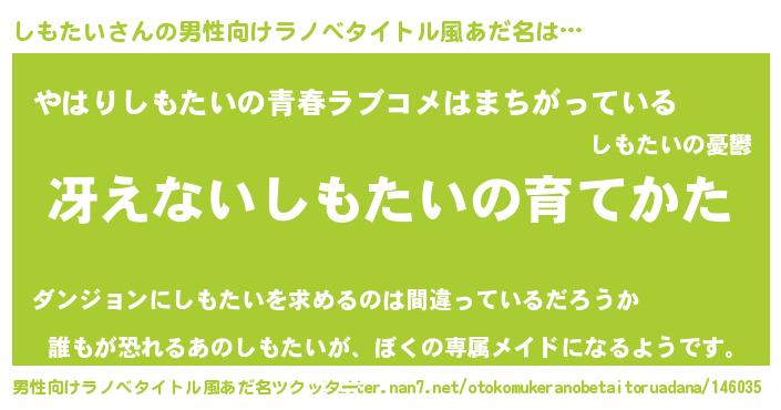 | ヘコむあだ名 | 『豆乳』『しもたい(苦笑)』『しもを』 |