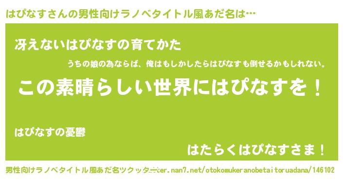 | 胡散臭い通販商品みたいなあだ名 | 『あなたにだけ特別に提供する世界で10本だけ現存している希少なブランデー…その名も「はぴなす」』 |