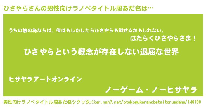 | 女子向けラノベタイトル風あだ名 | 『異世界で失敗しない100のひさやら』 |