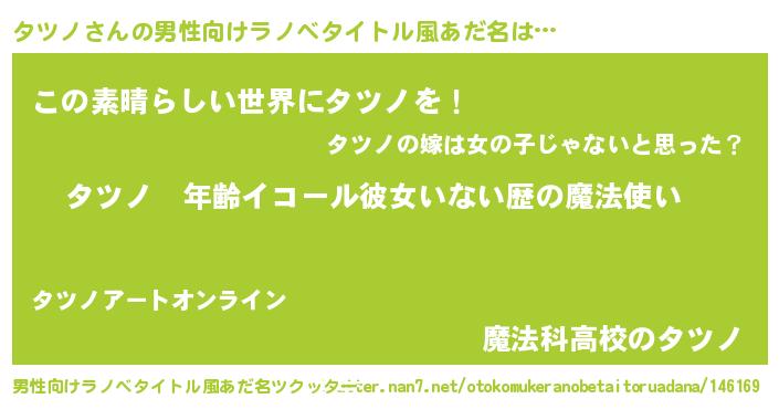 | 女子向けラノベタイトル風あだ名 | 『タツノの玉の輿計画!』 |