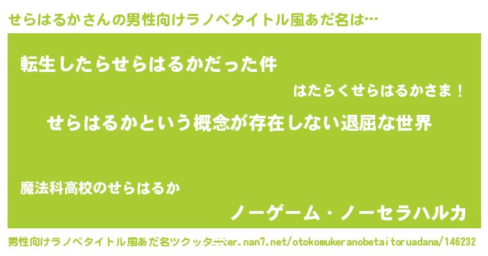| 女子向けラノベタイトル風あだ名 | 『異世界で失敗しない100のせらはるか』 |