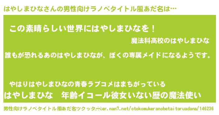 | 女子向けラノベタイトル風あだ名 | 『異世界でカフェはやしまひなを開店しました。』 |