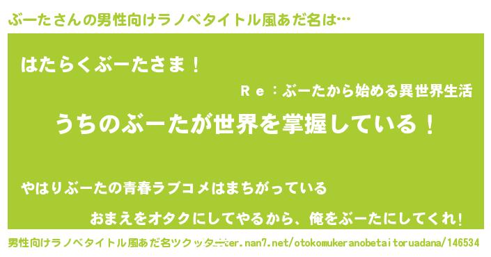 | ヒーロー風カッコイイあだ名 | 『慈愛の使者ぶーた』『超時空戦士ブータ』 |