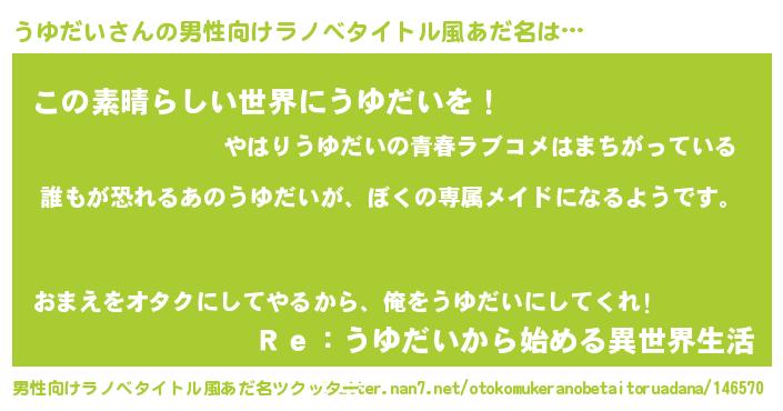 | 胡散臭い通販商品みたいなあだ名 | 『前代未聞の水素水…その名も「うゆだい」』 |
