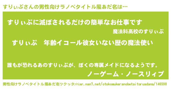 | 女子向けラノベタイトル風あだ名 | 『すりぃぷの玉の輿計画!』 |