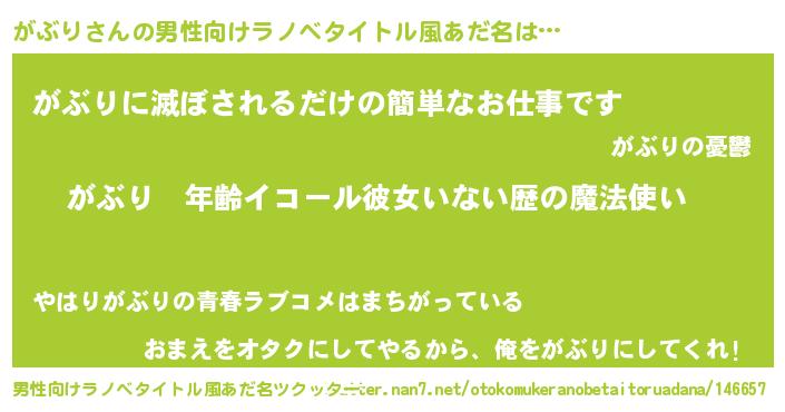 | 女子向けラノベタイトル風あだ名 | 『がぶりの玉の輿計画!』 |