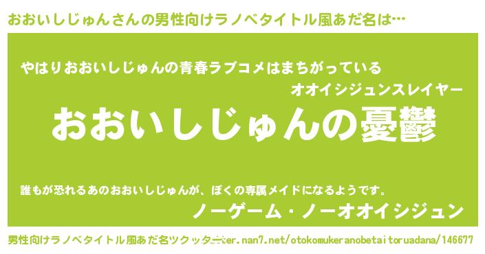 | 女子向けラノベタイトル風あだ名 | 『(仮)おおいしじゅんのやんごとなき事情』 |