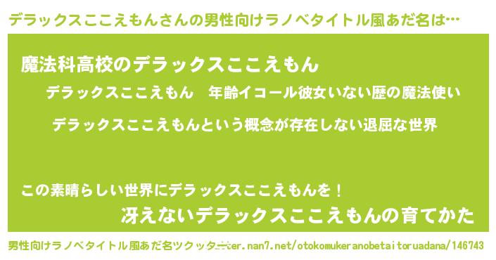 | 女子向けラノベタイトル風あだ名 | 『異世界で失敗しない100のデラックスここえもん』 |