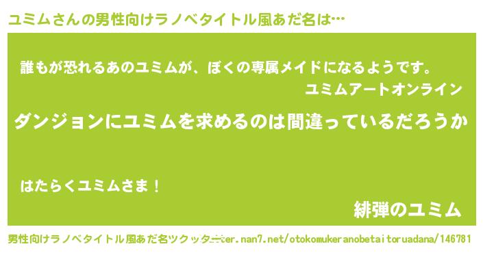 | 胡散臭い通販商品みたいなあだ名 | 『信頼と実績のサプリメント…その名も「ユミム」』 |