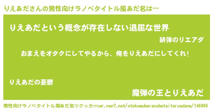 | 女子向けラノベタイトル風あだ名 | 『りえあだ夫妻のなれそめ』 |