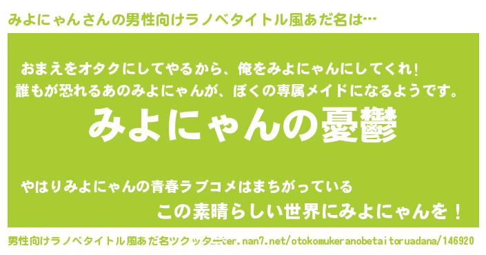 | 女子向けラノベタイトル風あだ名 | 『(仮)みよにゃんのやんごとなき事情』 |