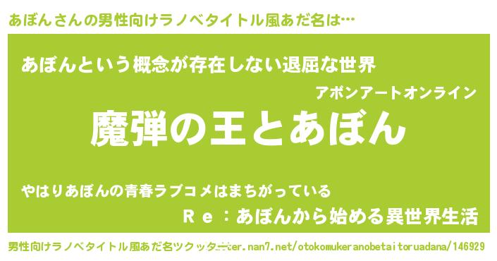 | 女子向けラノベタイトル風あだ名 | 『乙女ゲームの破滅フラグしかない悪役あぼんに転生してしまった…』 |