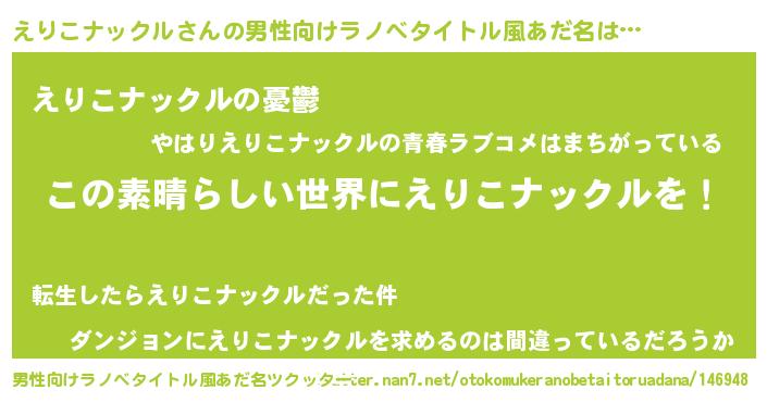 | 女子向けラノベタイトル風あだ名 | 『乙女ゲームの破滅フラグしかない悪役えりこナックルに転生してしまった…』 |