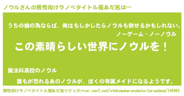 | 女子向けラノベタイトル風あだ名 | 『悪役ノウルに転生したようですが、知った事ではありません』 |