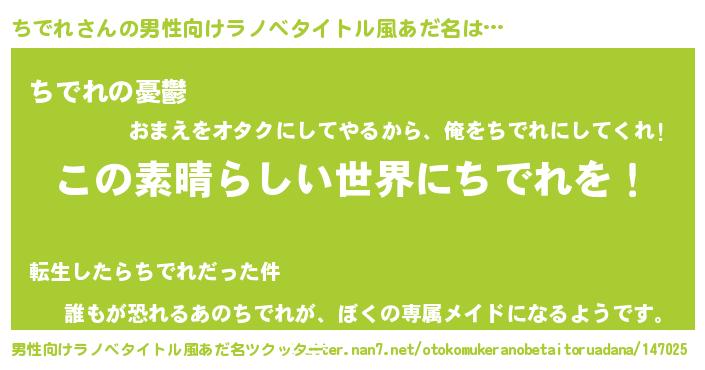 | 女子向けラノベタイトル風あだ名 | 『悪役ちでれに転生したようですが、知った事ではありません』 |