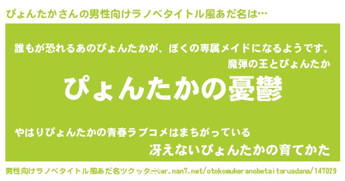| 女子向けラノベタイトル風あだ名 | 『(仮)ぴょんたかのやんごとなき事情』 |