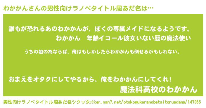 | 女子向けラノベタイトル風あだ名 | 『わかかん伯爵の花嫁』 |