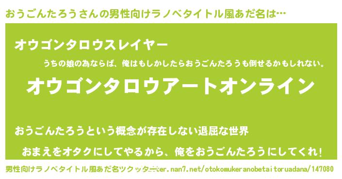 | 女子向けラノベタイトル風あだ名 | 『誰かこのおうごんたろうを説明してください! ~契約から始まるウェディング~』 |