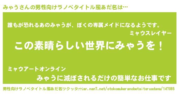 | 女子向けラノベタイトル風あだ名 | 『悪役みゃうに転生したようですが、知った事ではありません』 |