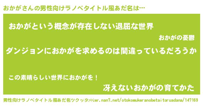 | 女子向けラノベタイトル風あだ名 | 『おかがの卵を拾いまして』 |