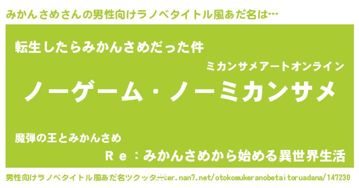 | 女子向けラノベタイトル風あだ名 | 『死神みかんさめの再婚』 |