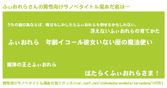 | 女子向けラノベタイトル風あだ名 | 『ふぃおれらの玉の輿計画!』 |