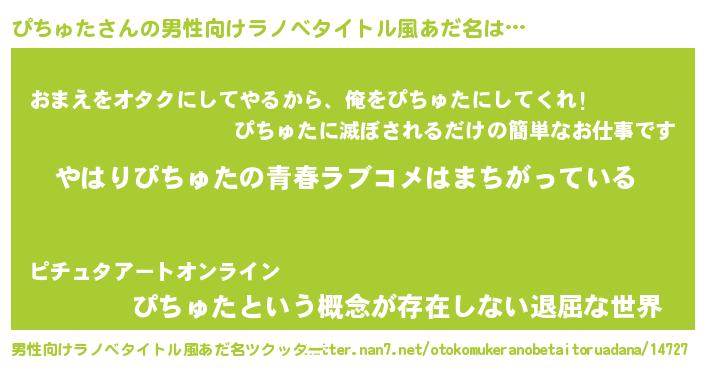 | 女子向けラノベタイトル風あだ名 | 『ぴちゅた伯爵の花嫁』 |