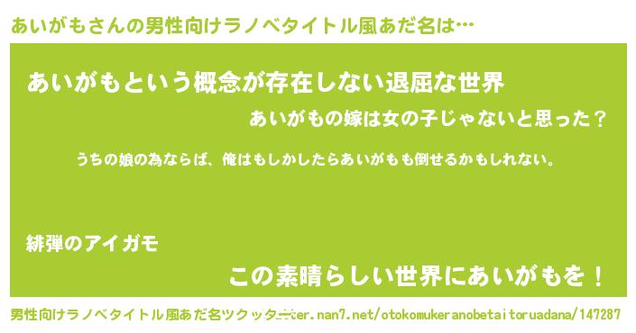 | 女子向けラノベタイトル風あだ名 | 『あいがも伯爵の花嫁』 |