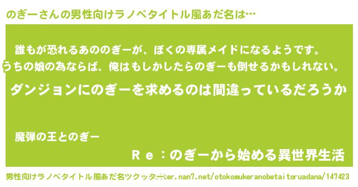 | 女子向けラノベタイトル風あだ名 | 『のぎーの卵を拾いまして』 |