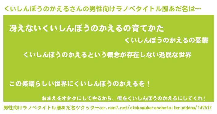 | 女子向けラノベタイトル風あだ名 | 『異世界で失敗しない100のくいしんぼうのかえる』 |