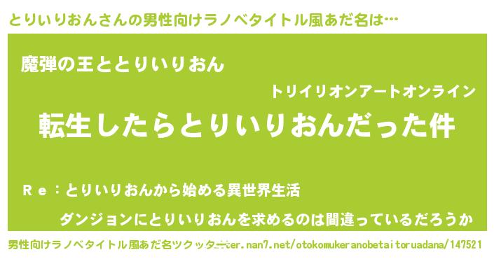 | 女子向けラノベタイトル風あだ名 | 『とりいりおんの玉の輿計画!』 |