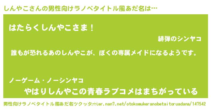| 女子向けラノベタイトル風あだ名 | 『しんやこの契約王妃』 |
