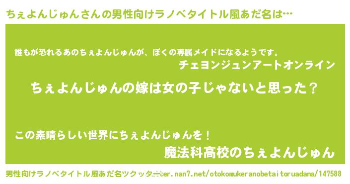 | 女子向けラノベタイトル風あだ名 | 『ちぇよんじゅんの卵を拾いまして』 |