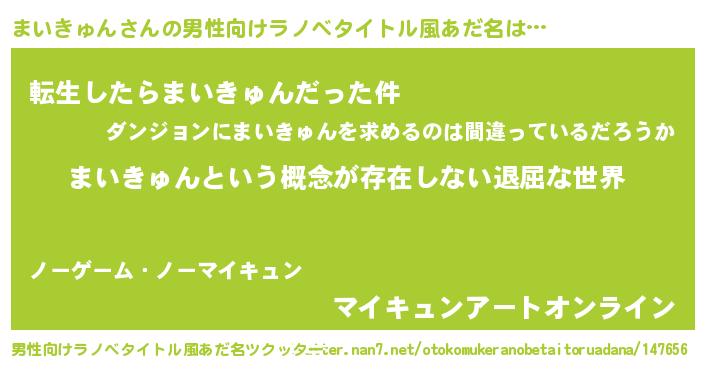 | 胡散臭い通販商品みたいなあだ名 | 『来世でも幸せになれる健康食品…その名も「まいきゅん」』 |