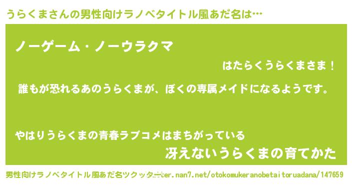 | ヘコむあだ名 | 『うらくま(笑)』『豆乳』『うらお』 |