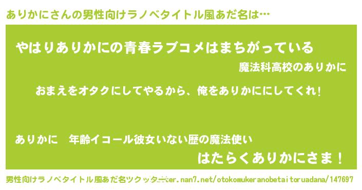 | 女子向けラノベタイトル風あだ名 | 『ありかに夫妻のなれそめ』 |