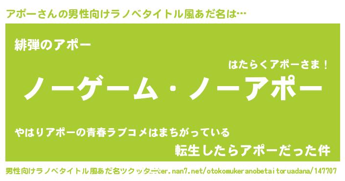 | 女子向けラノベタイトル風あだ名 | 『死神アポーの再婚』 |