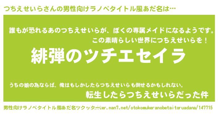 | 胡散臭い通販商品みたいなあだ名 | 『絶対に幸福をもたらす健康食品…その名も「つちえせいら」』 |