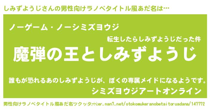 | 女子向けラノベタイトル風あだ名 | 『乙女ゲームの破滅フラグしかない悪役しみずようじに転生してしまった…』 |