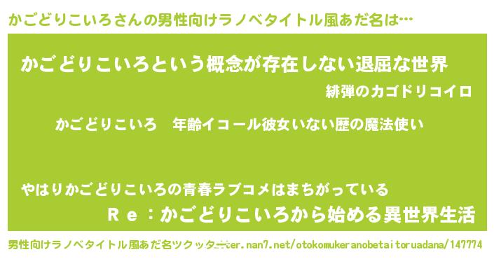 | 胡散臭い通販商品みたいなあだ名 | 『前代未聞の水素水…その名も「かごどりこいろ」』 |