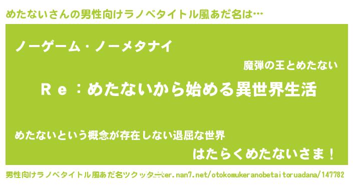 | 女子向けラノベタイトル風あだ名 | 『闇のめたない』『死神めたないの再婚』 |