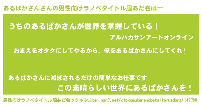 | 女子向けラノベタイトル風あだ名 | 『あるぱかさん夫妻のなれそめ』 |