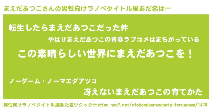 | 女子向けラノベタイトル風あだ名 | 『乙女ゲームの破滅フラグしかない悪役まえだあつこに転生してしまった…』 |