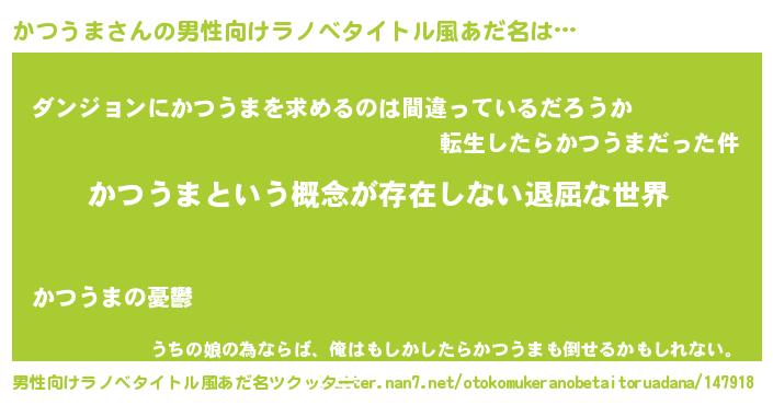 | 女子向けラノベタイトル風あだ名 | 『異世界で失敗しない100のかつうま』 |