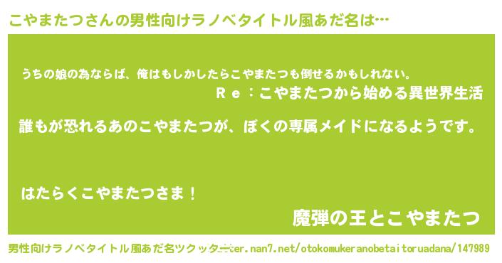 | 女子向けラノベタイトル風あだ名 | 『異世界でカフェこやまたつを開店しました。』 |