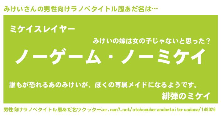 | 女子向けラノベタイトル風あだ名 | 『死神みけいの再婚』『みけい様がみてる』 |