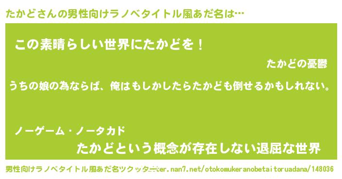 | ファンタジー風あだ名 | 『エターナルタカドー』『ヴァルタカーナ』 |