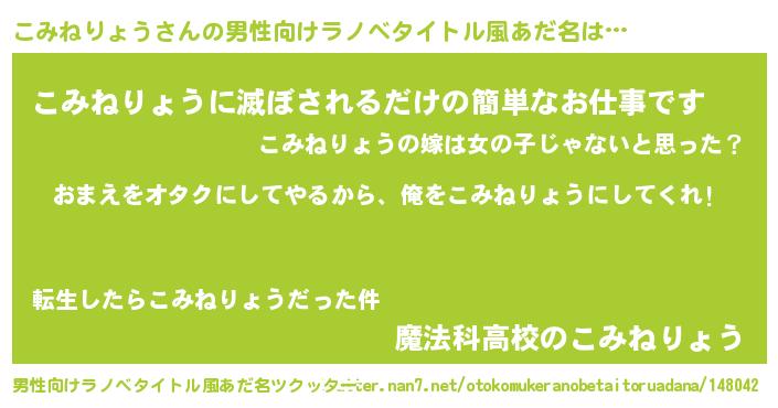 | 女子向けラノベタイトル風あだ名 | 『こみねりょう夫妻のなれそめ』 |