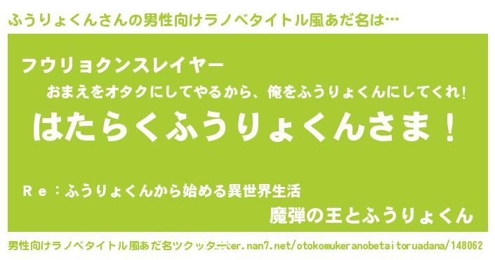 | 胡散臭い通販商品みたいなあだ名 | 『世界中を虜にした世界で10本だけ現存している希少なブランデー…その名も「ふうりょくん」』 |