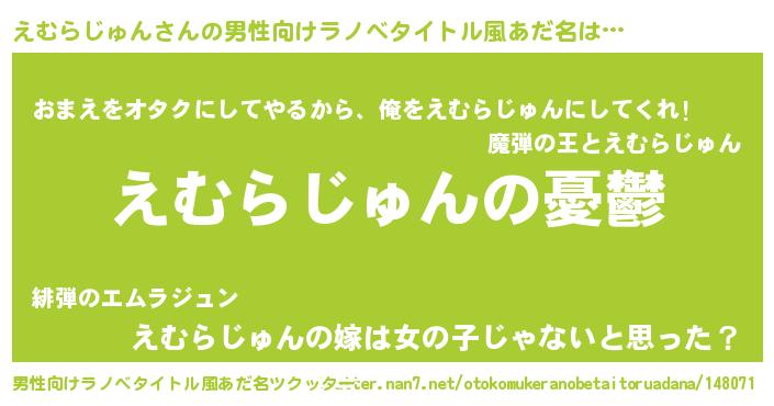 | 女子向けラノベタイトル風あだ名 | 『(仮)えむらじゅんのやんごとなき事情』 |